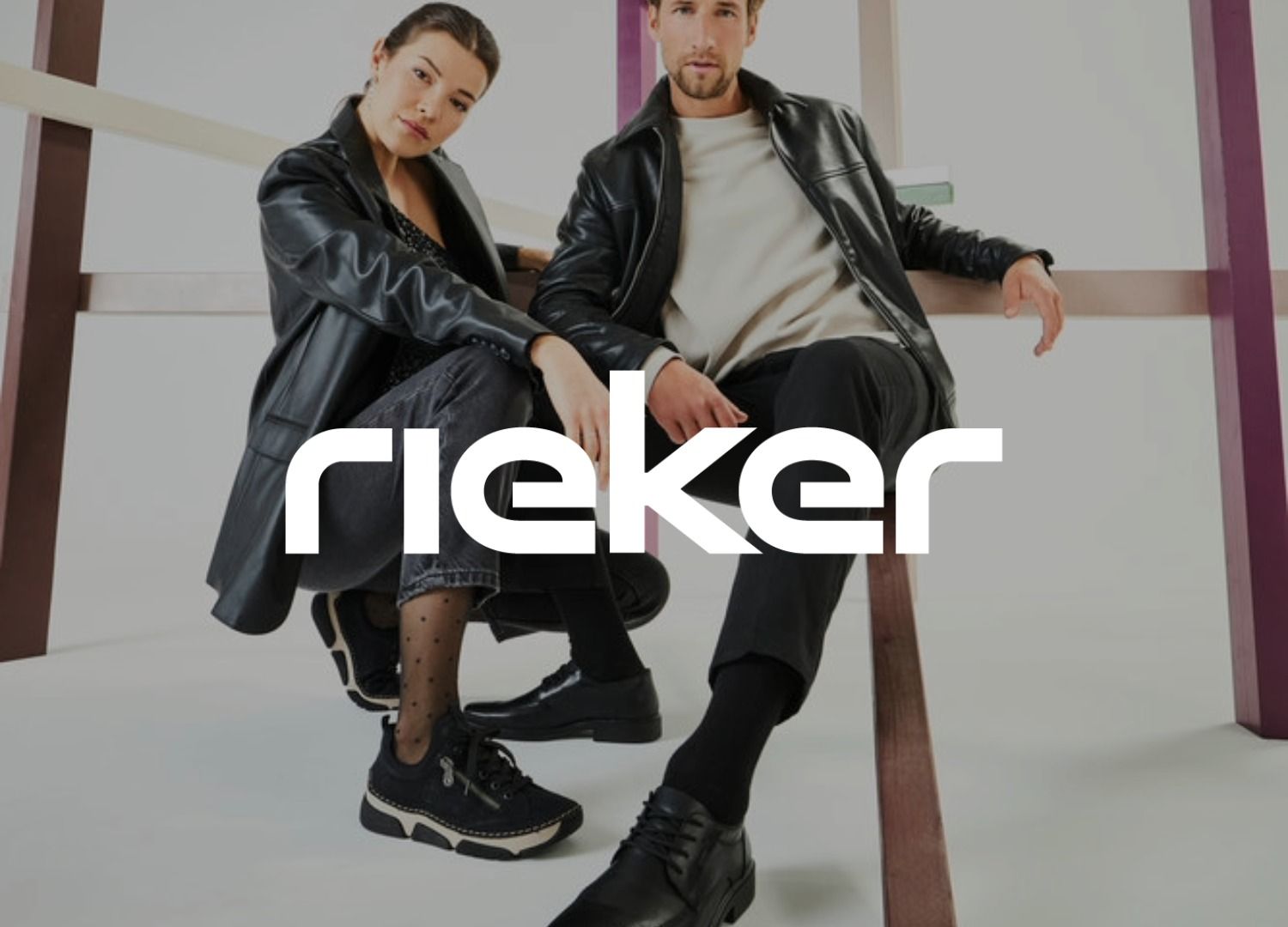 Zwei Models in stylischen schwarzen Outfits und Sneakern posieren selbstbewusst.Das Bild wird vom Logo der Marke Rieker überlagert.